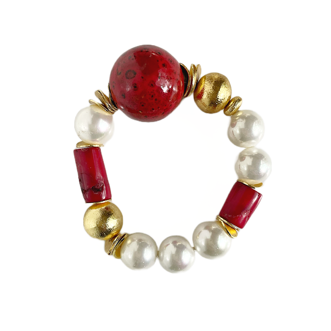 Signature red bead with pearl shell beads, red bamboo and gold-brushed beads and spacers.