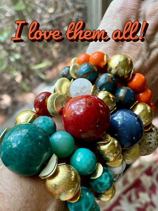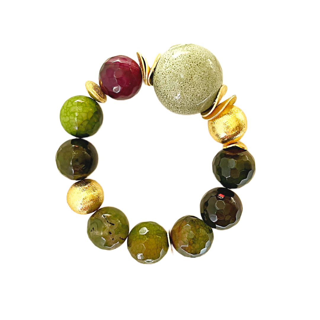 Mint signature bead with multi-green and pink-fired Agate with anti-tarnish, gold-brushed beads, spacers and disc. All BB bracelets are strung using flexible, strong cording making putting on and taking off easy and worry-free.