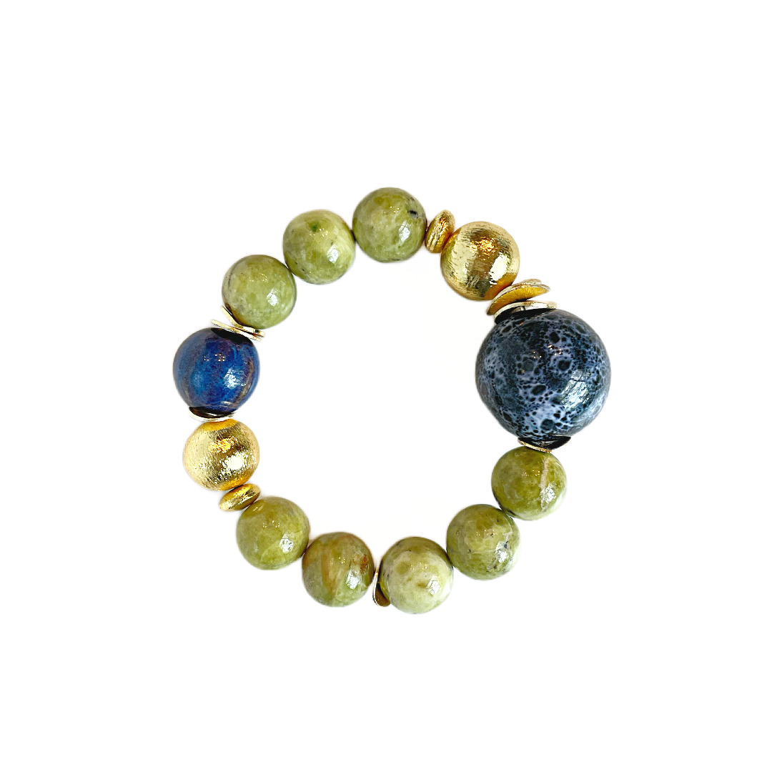 Blue signature bead with olive-green Jasper combined with gold-brushed beads and spacers.