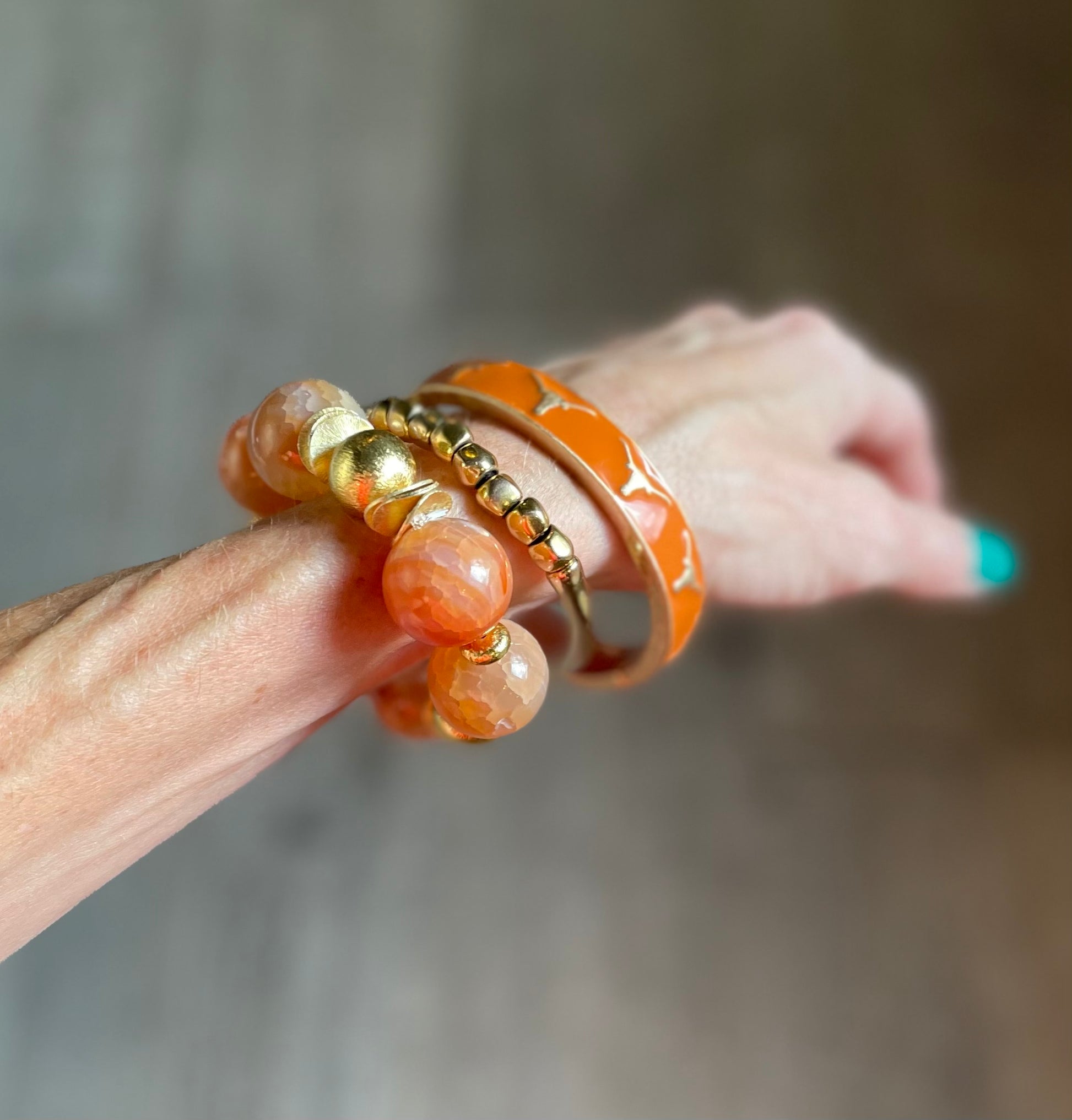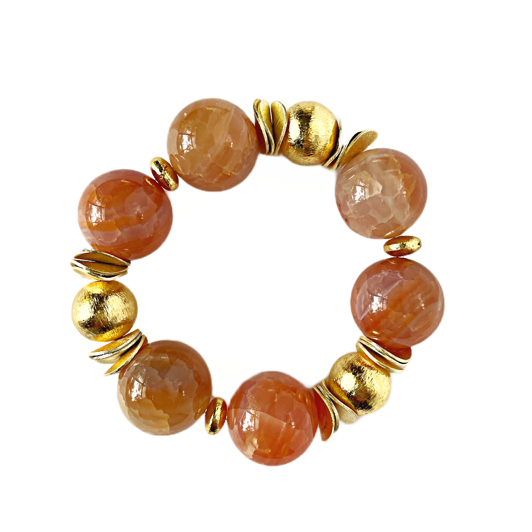 Gorgeous 20mm smooth Carnelian, orange-fired Agate combined with anti-tarnish, gold-brushed beads, spacers and discs.